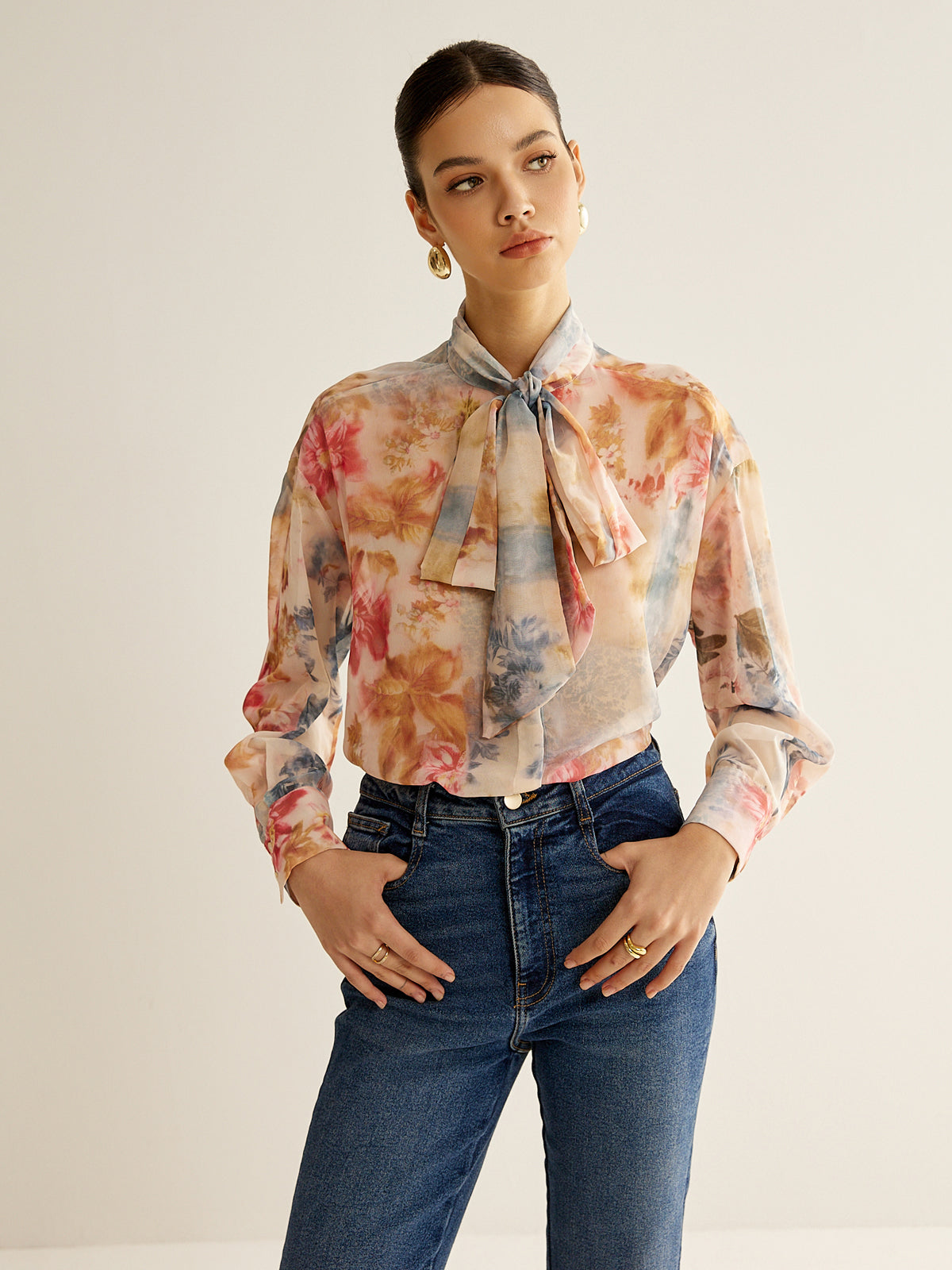 Cienka koszula z wiązanym kołnierzykiem w stylu romantycznym